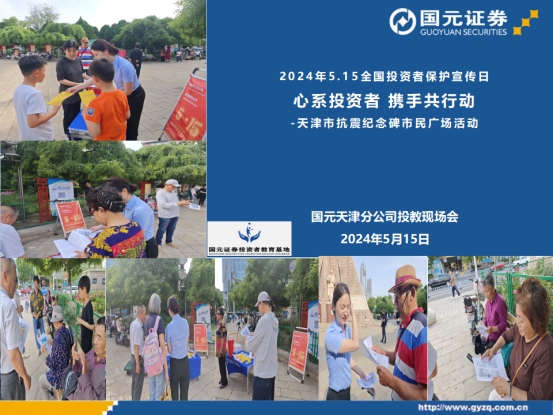 为深入学习贯彻习近平新时代中国特色社会主义思想,全面落实党的二十大精神和中央金融工作会议、中央经济工作会议部署要求,践行以投资者为本的理念,切实做好投资者教育宣传工作,国元证券投教基地联合天津分公司2024年5月15日下午,走进天津市抗震纪念碑市民广场,为投资者现场举办了以“心系投资者 携手共行动”为主题的5·15宣传活动。
